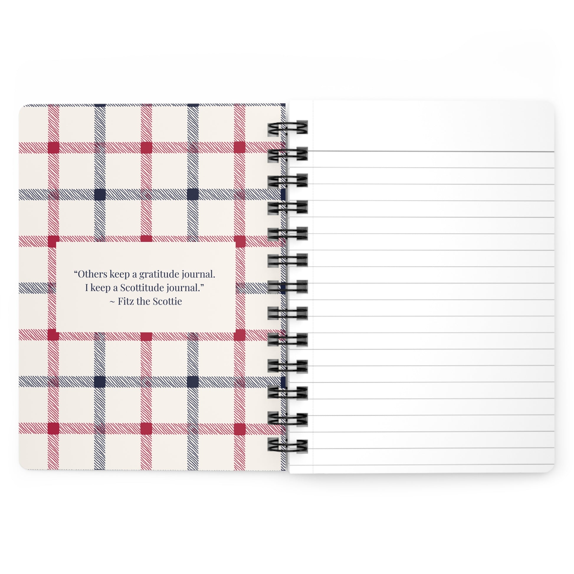 A spiral bound journal featuring a photo of FitztheScottie, a beloved Scottish Terrier on Instagram. The background is a soft blue, red and cream plaid, giving off a cozy and charming vibe. Inside cover includes a quote from Fitz about 'Scottitude'. Perfect for dog lovers and those who appreciate a little Scottitude in their lives. Ideal gift for pet owners, animal lovers, and anyone who adores Scottie dogs. Great for everyday use, as well as gifting on occasions like birthdays, Christmas, or as a back-to-school essential.